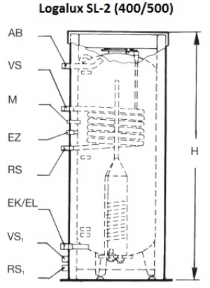 Buderus Logalux SL-2 объемом 400 и 500 л – напольные вертикальные бивалентные (с двумя змеевиками) термосифонные баки-водонагреватели косвенного типа синего или белого (модификация W) цвета, предназначенные для нагрева и хранения горячей воды при совместной работе с солнечным коллектором и/или котлом отопления. При подключении ТЭНа также возможна работа и от сети.